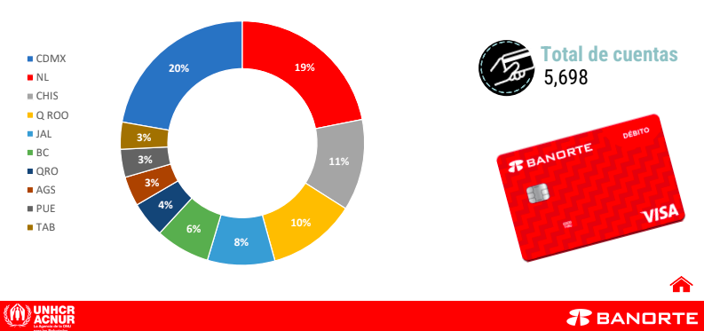 De acuerdo con Roberto Cano,México es uno de los países que recibe un número importante de refugiados. Expresó que la distribución de cuentas para refugiados muestra que la Ciudad de México lidera con un 20 por ciento de las contrataciones,seguida por Nuevo León con un 19 por ciento,Chiapas con el 11 por ciento y Quintana Roo con el 10 por ciento.