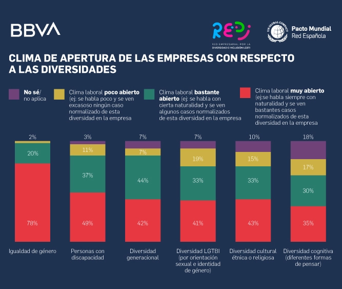 La diversidad LGBT+ es ya la tercera que más se trabaja en los proyectos de inclusión de las empresas, por detrás de la igualdad de género y la inclusión de personas con discapacidad. La mitad de las grandes empresas españolas a las que hemos consultado cuenta con programas de diversidad LGBT+, un dato que se reduce hasta el 34% en el caso de las compañías que forman el IBEX 35. Progresivamente, cada vez más empresas cuentan con estos programas. En estos entornos, se reduce el número de las personas LGBT+ que renuncian a sus derechos laborales y a visibilizarse, en comparación con las empresas donde no cuentan con ellos. Estas son algunas de las conclusiones del primer gran estudio que analiza la gestión empresarial de la diversidad LGBT+ en España, promovida por BBVA, REDI y Pacto Mundial de la ONU España.