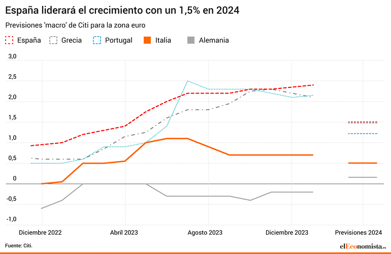 Las estimaciones del banco apuntan a un avance del 1,5% en 2024 para España y Grecia, y del 1,2% para Portugal. Por detrás quedaría Italia, con un 0,5% estimado, y Alemania, que crecería al menor ritmo de los cinco, un 0,2% interanual.