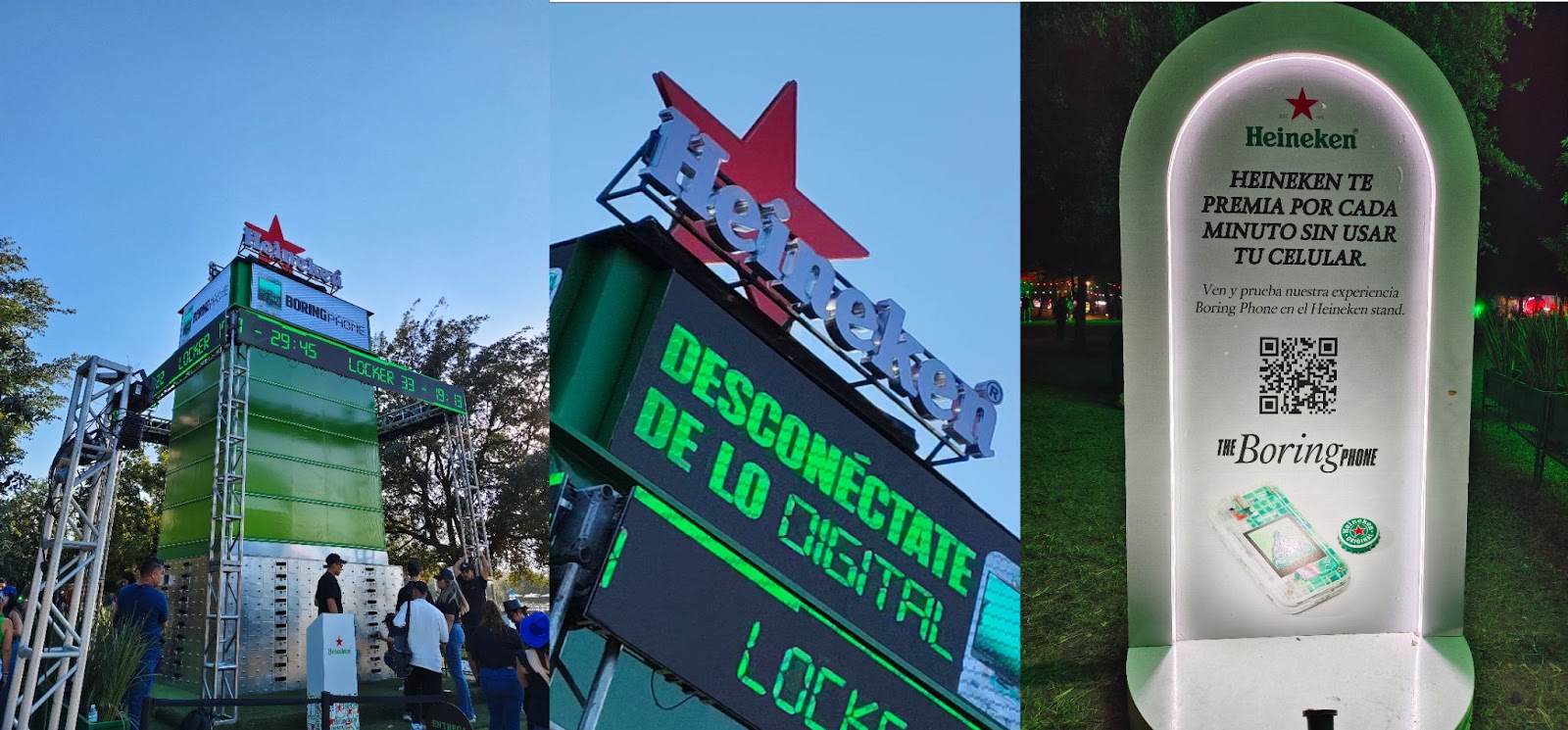 Esa no fue,no obstante,la única acción que preparó la cervecera para disminuir el uso del celular: a lo largo y en el transcurso del festival,desplegó una serie de activaciones para despojarse de él,reconectar con el evento e,incluso a ser recompensados por ello. La principal fue una especie de torre que contenía lockers en los que los asistentes podían dejar su smartphone bajo llave y,recibir a cabo,un Boring Phone que se encontraba al interior. Al momento de cerrar la puerta,empezaba a correr un cronómetro.