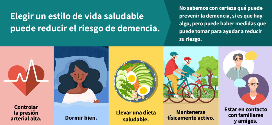 Muchos factores pueden influir en su riesgo de demencia, entre ellos, los genes, el entorno y el estilo de vida. Aunque no puede cambiar algunos de estos factores, como con muchas otras enfermedades, puede haber medidas que puede tomar para ayudar a reducir su riesgo. En general, llevar un estilo de vida saludable puede ayudar a abordar los factores de riesgo que se han asociado con la enfermedad de Alzheimer y las demencias relacionadas.