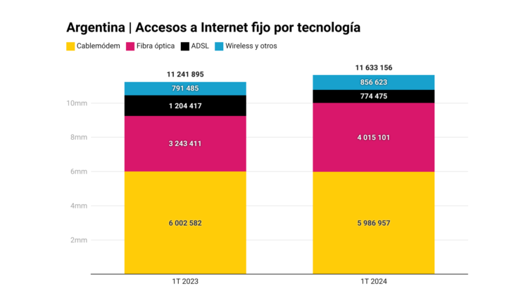Casi 772 mil altas en el último año dieron como resultado que existan en Argentina más de 4 millones de accesos a Internet vía fibra óptica al primer trimestre de 2024. Las cifras presentadas por el Ente Nacional de Comunicaciones (Enacom) dan cuenta de que la tecnología representa 34.5 por ciento de los accesos a este servicio en el país.
