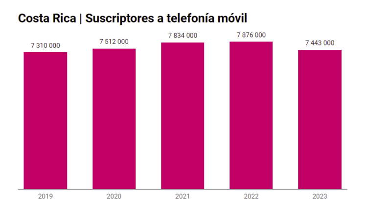 Costa Rica cerró 2023 con 7.44 millones de suscriptores al servicio de telefonía móvil,cifra 5.5 por ciento más baja que la informada un año atrás. La penetración del servicio se ubicó en 141.4 por ciento. La caída fue resultado de una reducción de 12.6 por ciento en la modalidad prepago,que fue parcialmente soportada por un alza de 6.1 por ciento para el pospago.