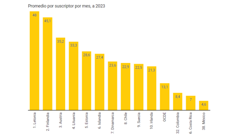 Con un crecimiento de más de 20 por ciento interanual,Chile terminó 2023 en octavo lugar en el ranking de uso de datos móviles por usuario entre países de la OCDE (Organización para la Cooperación y el Desarrollo Económico). Con un promedio de 22.9 GB,se posicionó incluso por encima del promedio del bloque. Del otro lado quedaron Colombia,Costa Rica y México,que se ubicaron entre los ocho peores.