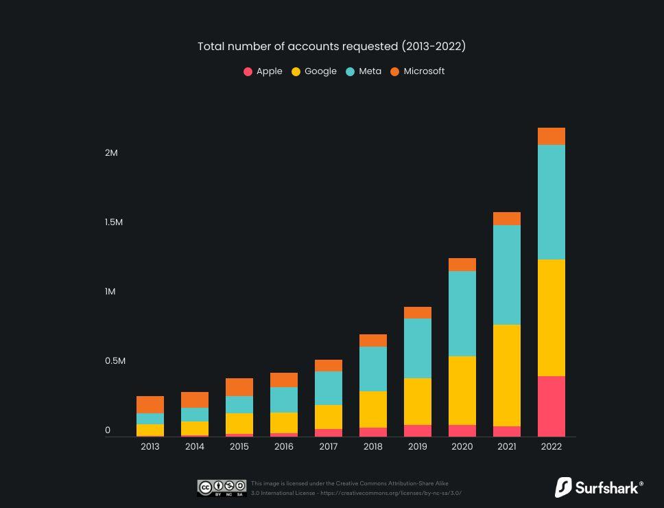 En el mundo,el total de solicitudes ascendió a 9 millones de cuentas combinadas de Apple,Google,Meta y Microsoft en la década analizada. Estados Unidos y la Unión Europea representaron 58 por ciento de los pedidos; el número de solicitudes aumentó ocho veces entre 2013 y 2022.